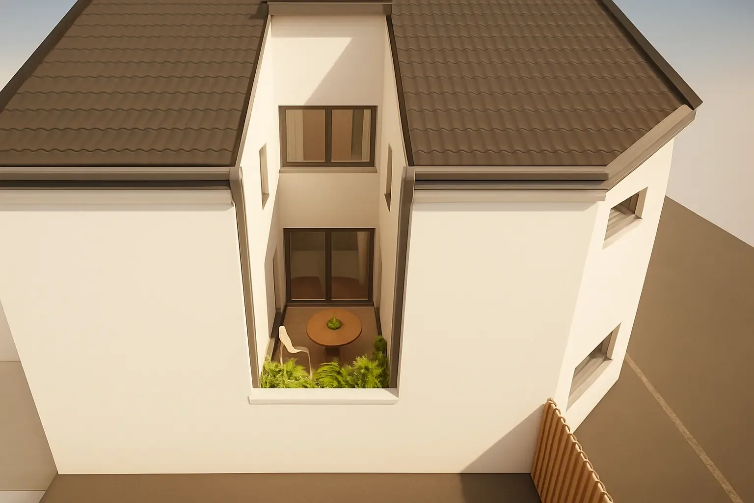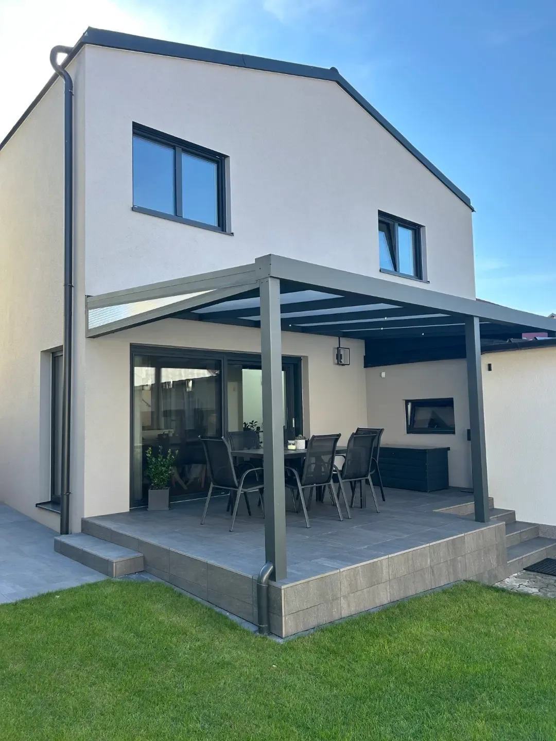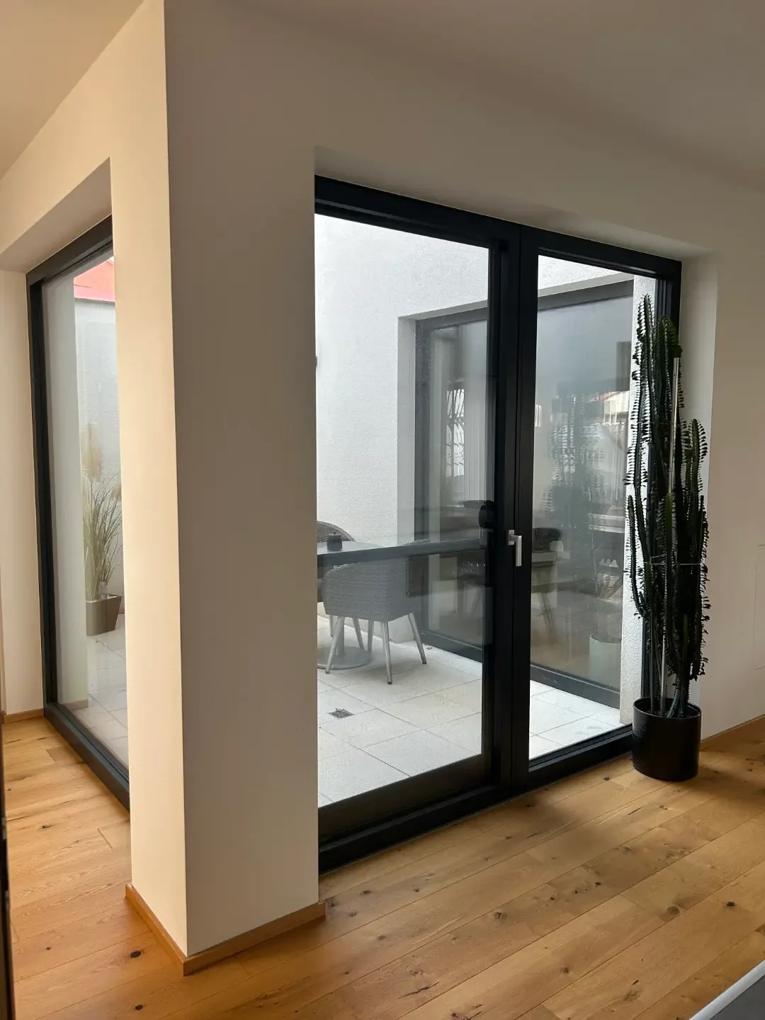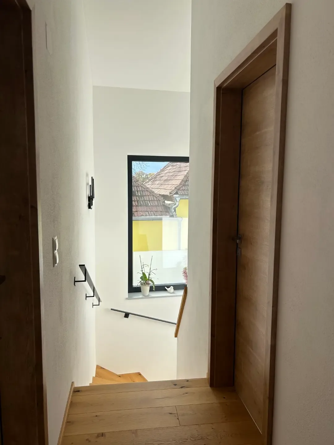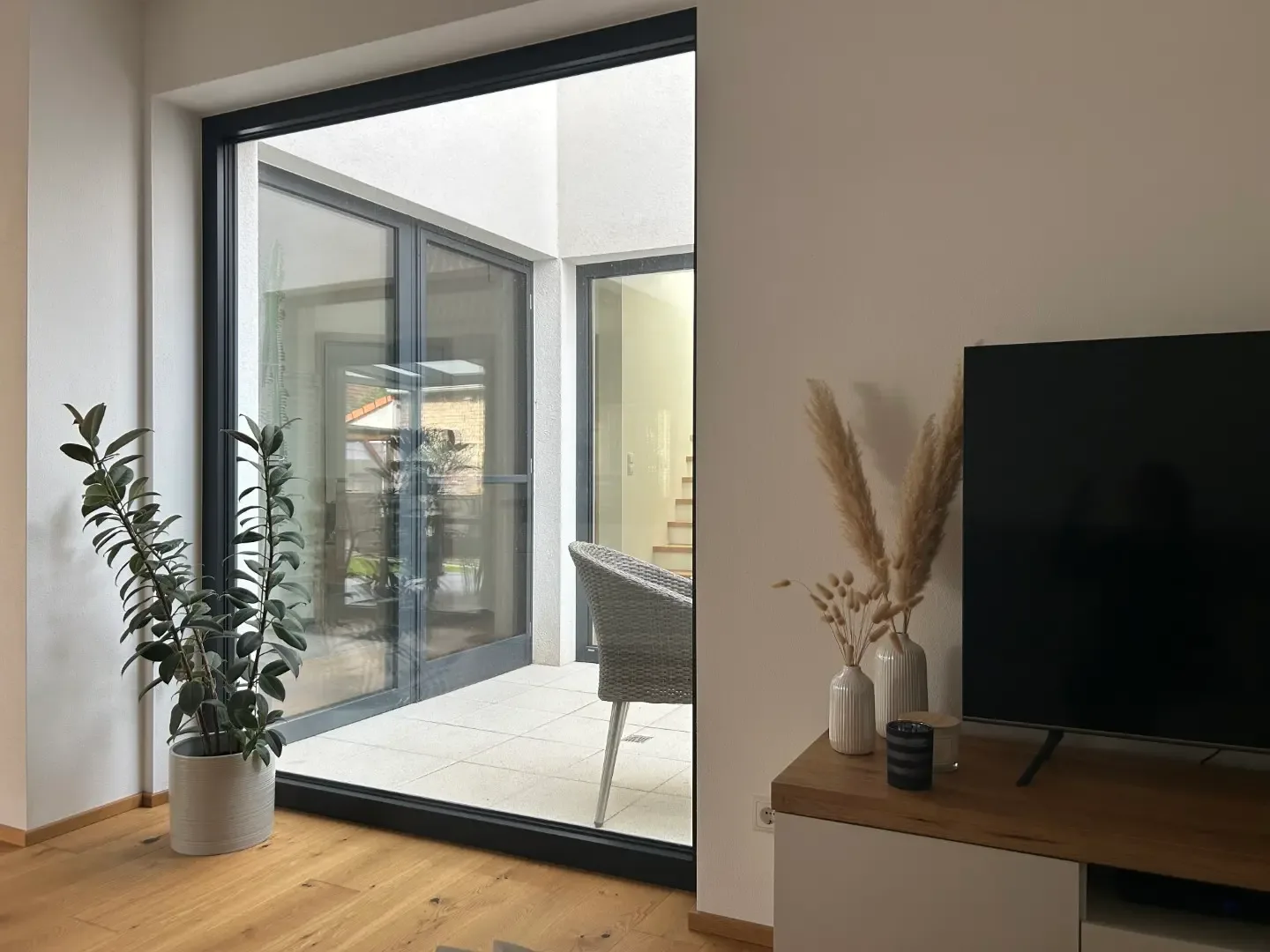 Weiters befindet sich ein extra WC und der Technikraum im Erdgeschoß. Sowie das Herzstück des Hauses: der kleine, der Küche gegenüberliegende, Innenhof! Mit seinen großen Fensteröffnungen bringt er zusätzliches Licht in den Wohnraum und lädt zum Verweilen und Entspannen ein.